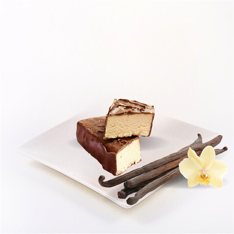 Tyčinka plněná lískooříškovou pastou a pastou s vanilkovou příchutí, lískooříšky a křupinkami z mléčného proteinu, v mléčné čokoládové polevě. Se sladidlem. Nízký obsah cukru.